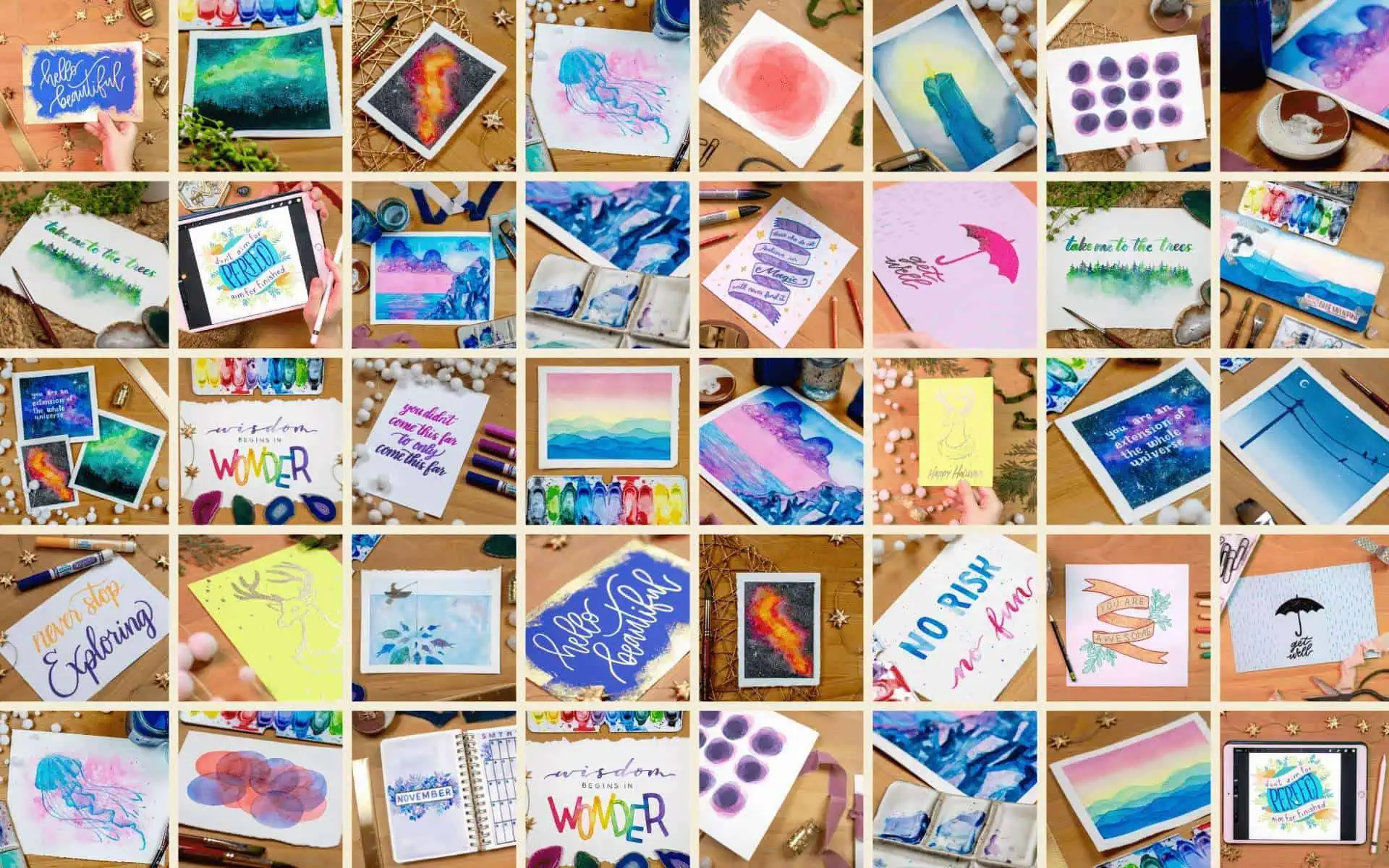 Dive into our diverse range of 234 on-demand classes, from mastering watercoloring to exploring the art of hand lettering and creative journaling.